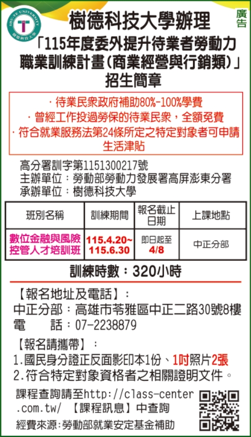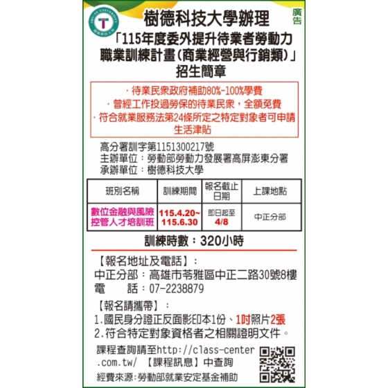 樹德科技大學即將開設「數位金融與風險控管人才培訓班」,讓您收穫滿滿,歡迎有興趣的待業者參加!