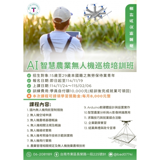 招生對象:1. 高中職以上且15 歲至29 歲本國籍之無勞保待業青年。2. 僅限於首次參加、且在訓練期間無其他工作或訓練的待業青年。參加者不得為在職勞工、自營作業者或公司或行(商)號負責人,且近一年內未參加過政府辦理的相關職訓課程。若曾參加過本計畫或其他類似計畫並中途放棄,亦不得再次報名。3. 以電機/電子/工業/機械/科技/農業/工程相關科系背景為佳。4. 有意投入科技農業者或對無人機空拍、巡檢等飛行操控技巧、AI 影像辨識興趣者 。