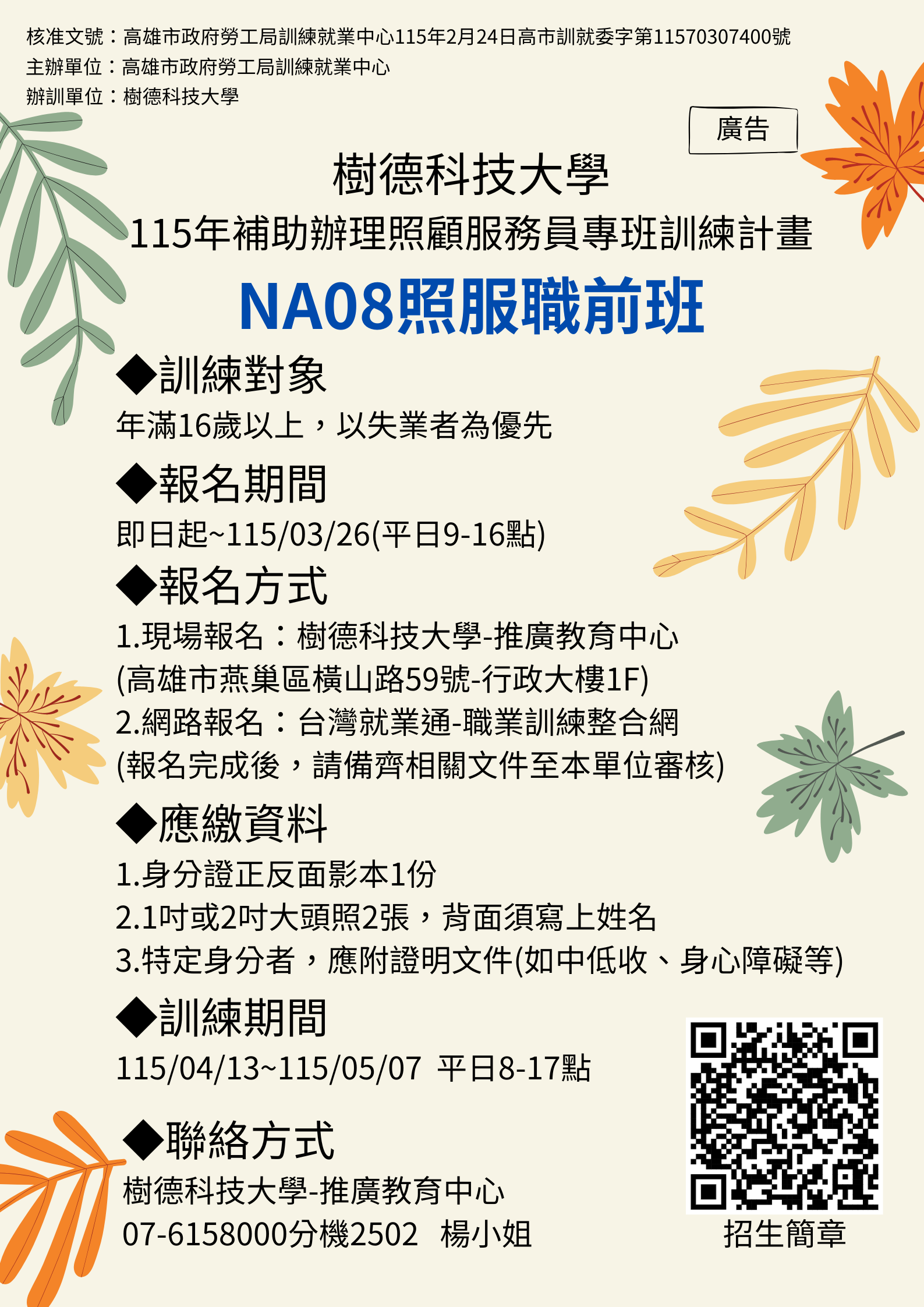 報名專線:(07)615-8000轉2502 楊小姐