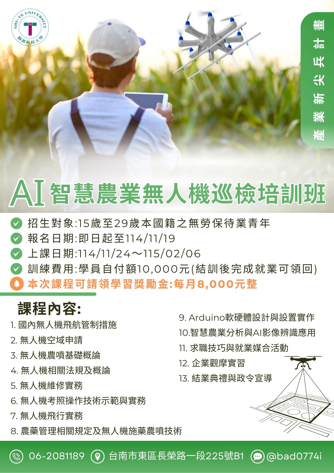 招生對象:1. 高中職以上且15 歲至29 歲本國籍之無勞保待業青年。2. 僅限於首次參加、且在訓練期間無其他工作或訓練的待業青年。參加者不得為在職勞工、自營作業者或公司或行(商)號負責人,且近一年內未參加過政府辦理的相關職訓課程。若曾參加過本計畫或其他類似計畫並中途放棄,亦不得再次報名。3. 以電機/電子/工業/機械/科技/農業/工程相關科系背景為佳。4. 有意投入科技農業者或對無人機空拍、巡檢等飛行操控技巧、AI 影像辨識興趣者 。