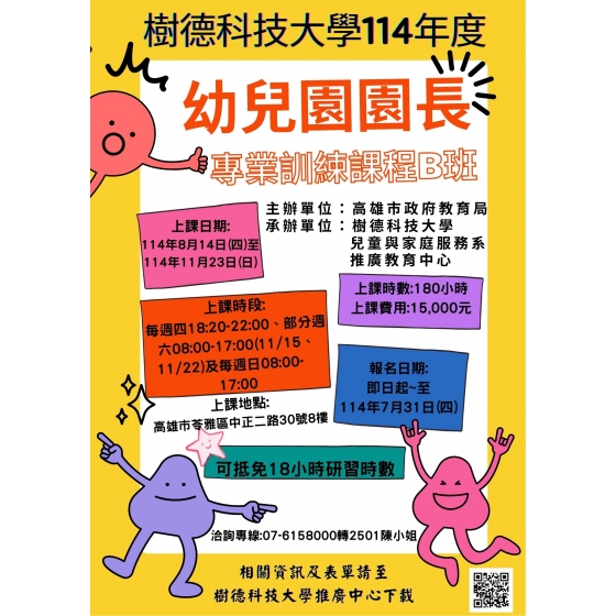 一、招生依據:「幼兒園園長專業訓練辦法」第3條規定及高雄市政府教育局114年3月14日訂立(113)高市教育合約
