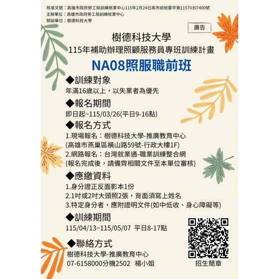 樹德科技大學【照顧服務員職前平日班】招生中!