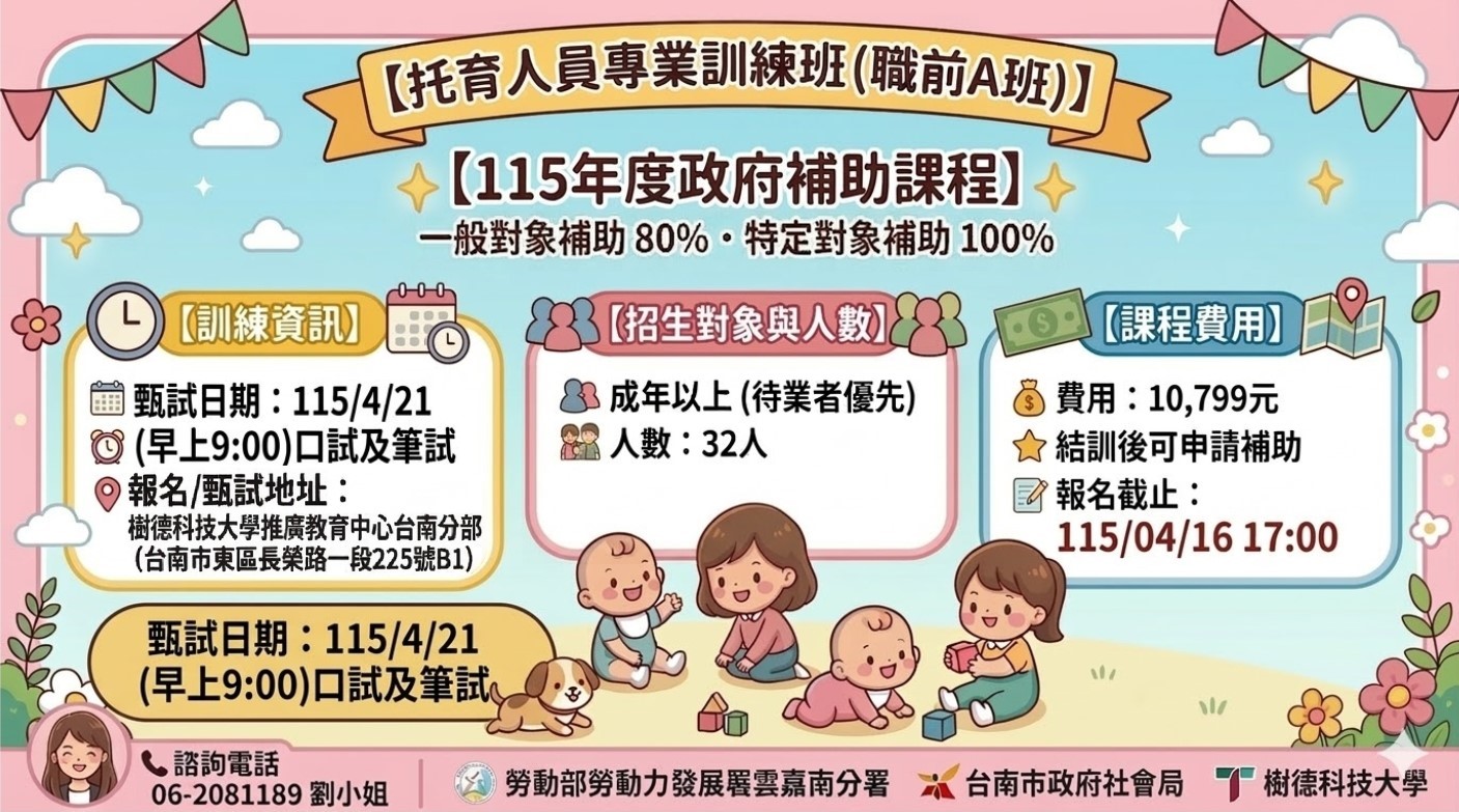 【托育人員專業訓練班(職前A班)】正式招生中